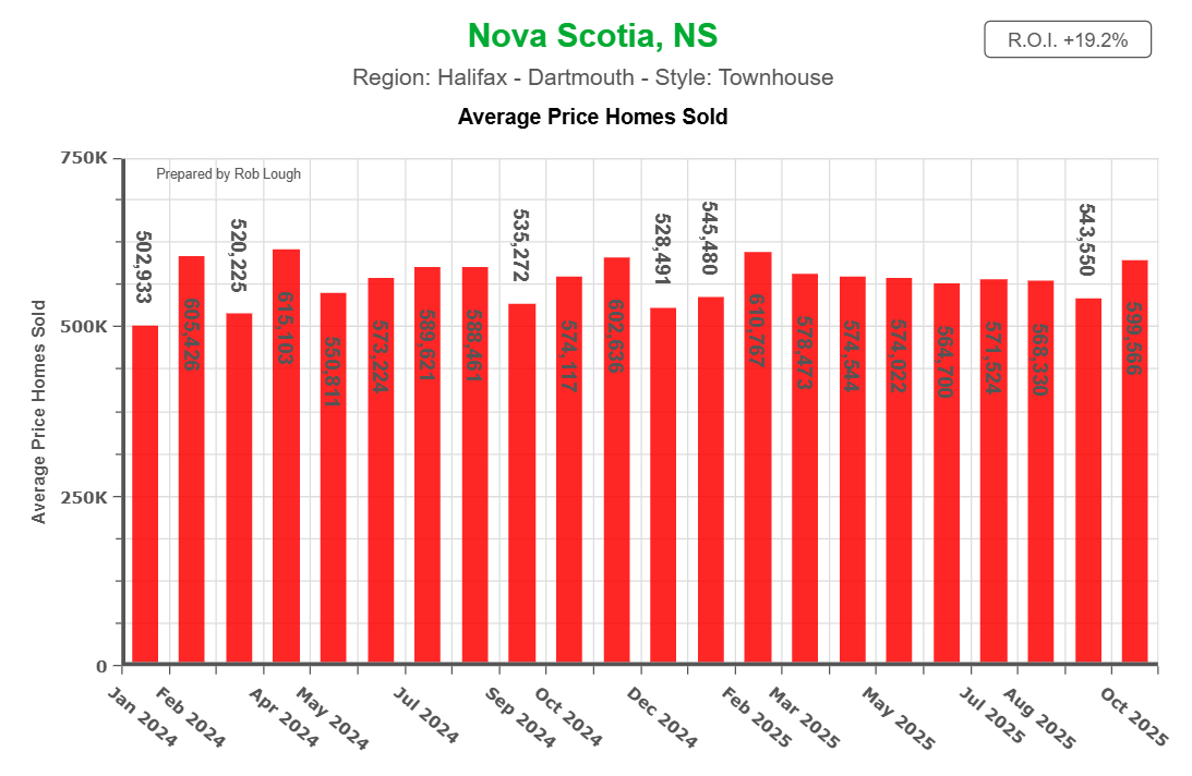 Townhouses have emerged as one of the star performers in the Halifax-Dartmouth market, posting impressive 19.2% year-over-year appreciation. The nearly $97,000 increase in average price from January ($502,933) to October ($599,566) reflects intense demand for this property type, which offers more space than condos while remaining more affordable than detached homes.