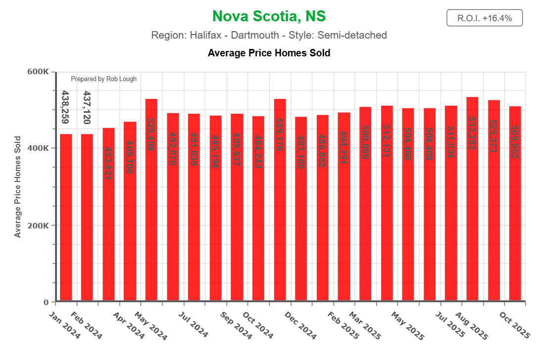 Detached homes continue to command premium prices in the Halifax-Dartmouth market, attracting families and move-up buyers seeking established neighborhoods, yards, and traditional single-family living. While the 11.2% year-over-year return is the most modest among all property types, it represents solid appreciation for the market's highest-priced segment. The acceleration in price momentum since June suggests strong demand has persisted through what is typically a slower autumn period.