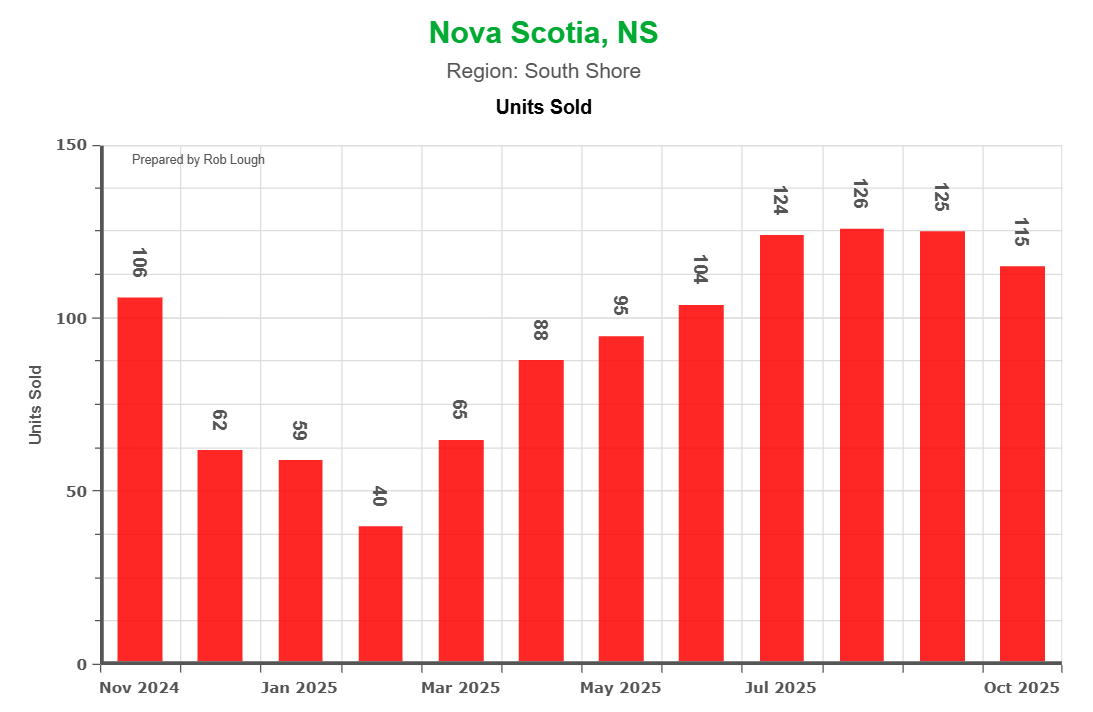 The South Shore housing market followed a distinctive pattern in 2025, with transaction volumes reflecting Nova Scotia's characteristic seasonal trends. March represented the year's quietest period with just 40 units changing hands, while the summer months delivered peak performance with July, August, and September each recording over 120 transactions.