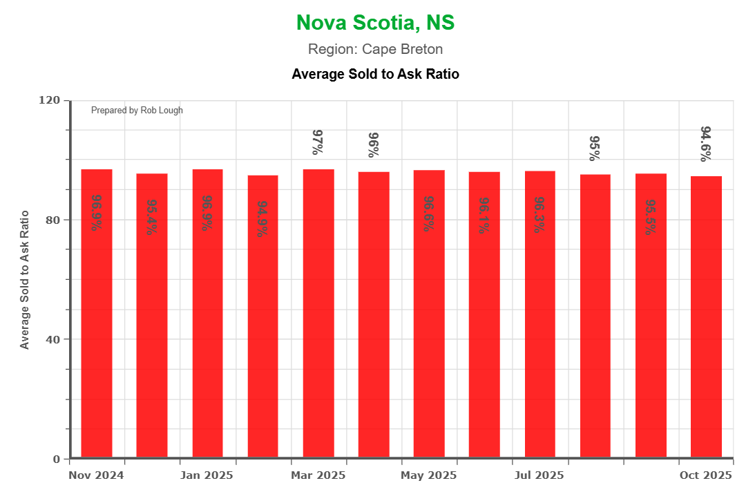 The average sold-to-ask ratio of 94.6% demonstrates that Cape Breton sellers continue to achieve strong returns relative to their listing expectations. While slightly lower than peak ratios earlier in the year, this figure indicates that homes remain competitively priced and that buyer demand supports asking prices in most segments.