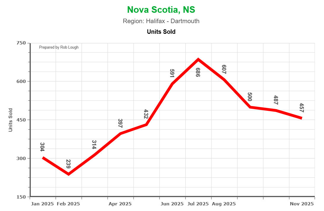 Halifax's real estate market followed a predictable but pronounced seasonal arc through 2025. Sales volumes climbed steadily from roughly 300 transactions in January to a summer peak approaching 680 units in July, more than doubling winter activity. As fall arrived, transaction counts retreated but remained well above the slower winter months.