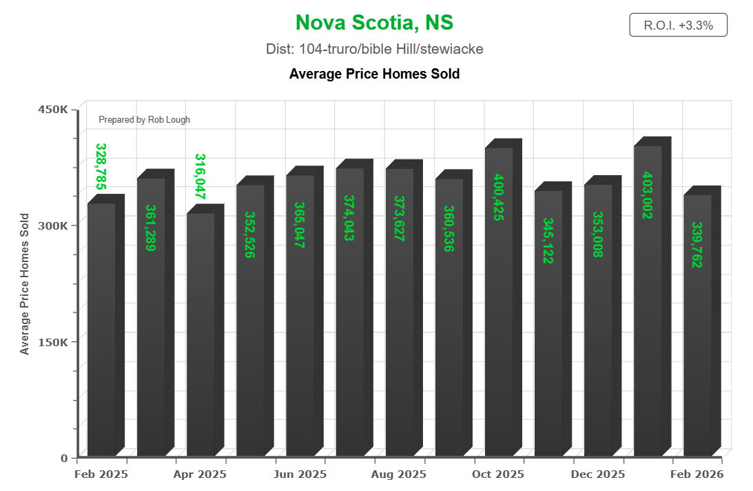 On a year-over-year basis, the district has posted a return on investment of +3.3%, which reflects the overall resilience of the central Nova Scotia corridor even as momentum softened through the winter months. The price trajectory through 2025 saw a steady climb from the low-$300,000s in early spring through peaks above $400,000 in the fall before settling back into the mid-$300,000 range.
