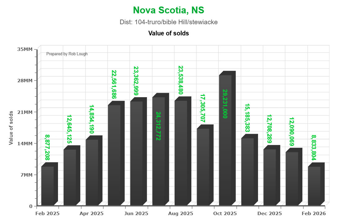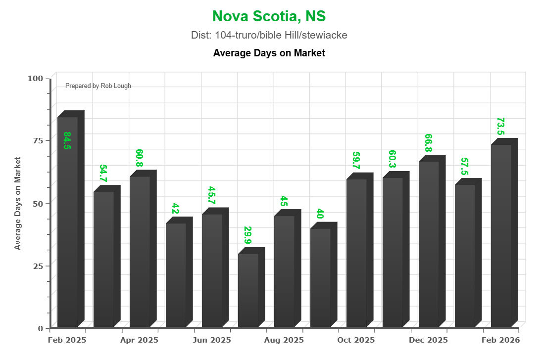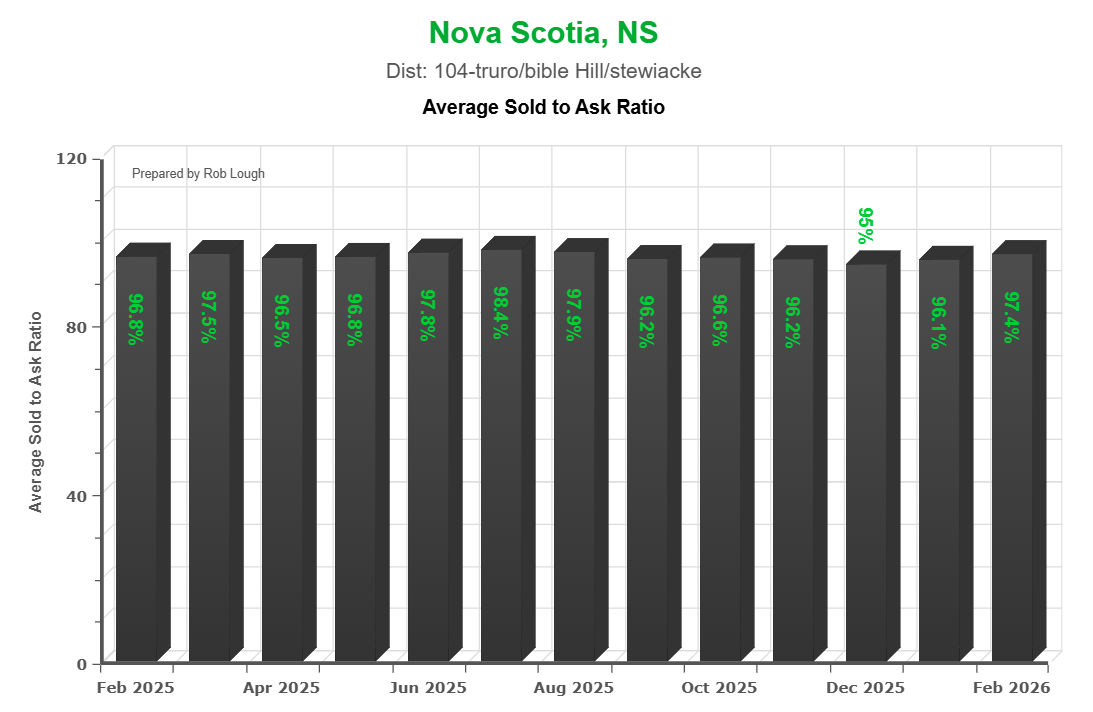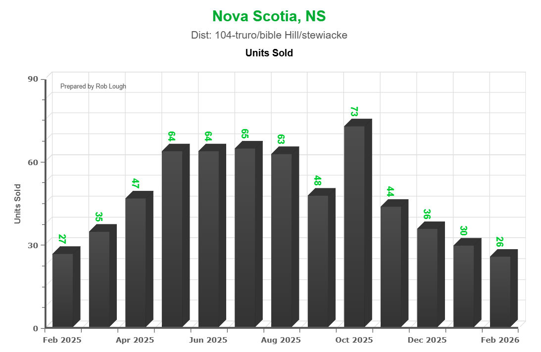 Data Sources: District 104 (Truro/Bible Hill/Stewiacke) market visualizations prepared by Rob Lough, Nova Scotia Association of Realtors, Canadian Real Estate Association. All statistics represent snapshot data from February 2026 and are subject to revision.